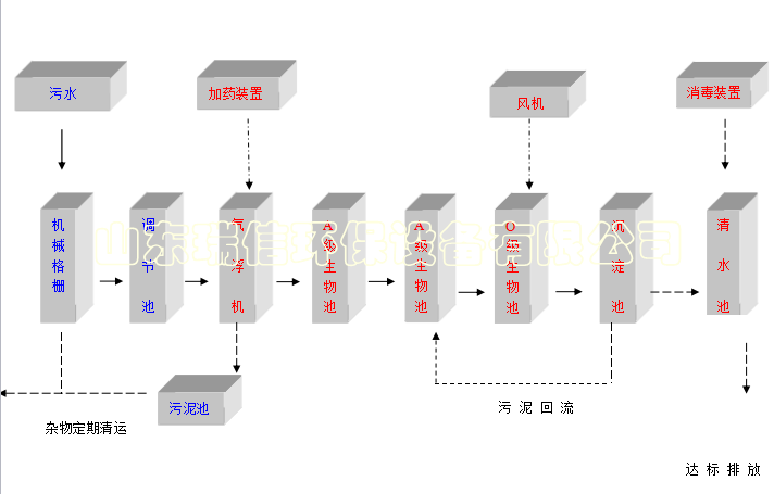 針對該項目具體污水水質(zhì)的特點,本方案擬采用常規(guī)的“氣浮機(jī)(加藥)+A/O/O生物接觸氧化+消毒設(shè)備”工藝,該處理工藝較為成熟,操作運(yùn)行方便,日常費(fèi)用低廉,出水穩(wěn)定,主要設(shè)備為鋼結(jié)構(gòu),考慮到周邊環(huán)境和衛(wèi)生問題,故該污水處理工程決定采用全埋地式結(jié)構(gòu),上部覆土,種植花木、草坪,進(jìn)一步美化環(huán)境。